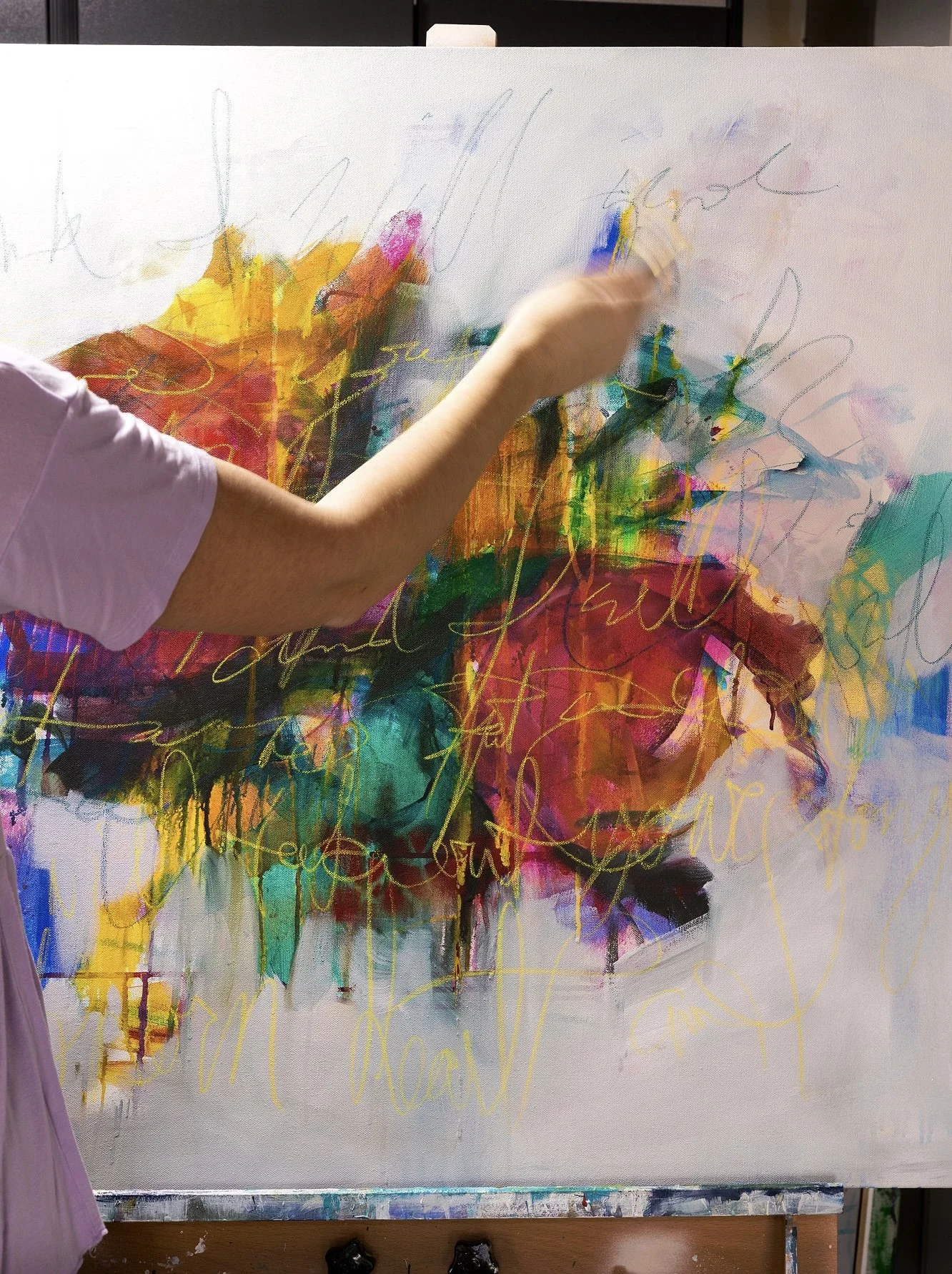 It began as a private way to process thoughts or ideas, often influenced by scripture as I work through the layers of painting. As this process developed I began to see how it not only allowed me to ponder the meaning, but the final piece showed bits and pieces of influence from each layer, mimicking how we can be transformed ourselves when we allow these seeds to move from our minds to our hearts. Just as each layer of paint shapes the next, our lives are formed by the truths, experiences, and faith we carry deep within us. The process is rarely perfect — mistakes, smudges, and rewrites remain — yet these “imperfections” echo the beauty of being human. I began sharing these hidden sentiments while traveling for art shows and found that collectors resonated with and found a deeper connection to the paintings when they knew these hidden layers. This has become my ultimate gaol as an artist. To create something of beauty to adorn your walls that carries a deeper meaning so that when you look at your painting you are uplifted, encouraged, hopeful & reminded of your own powerful journey. Each painting 16x20 and larger comes with a certificate of authentication that includes the hidden script beneath.