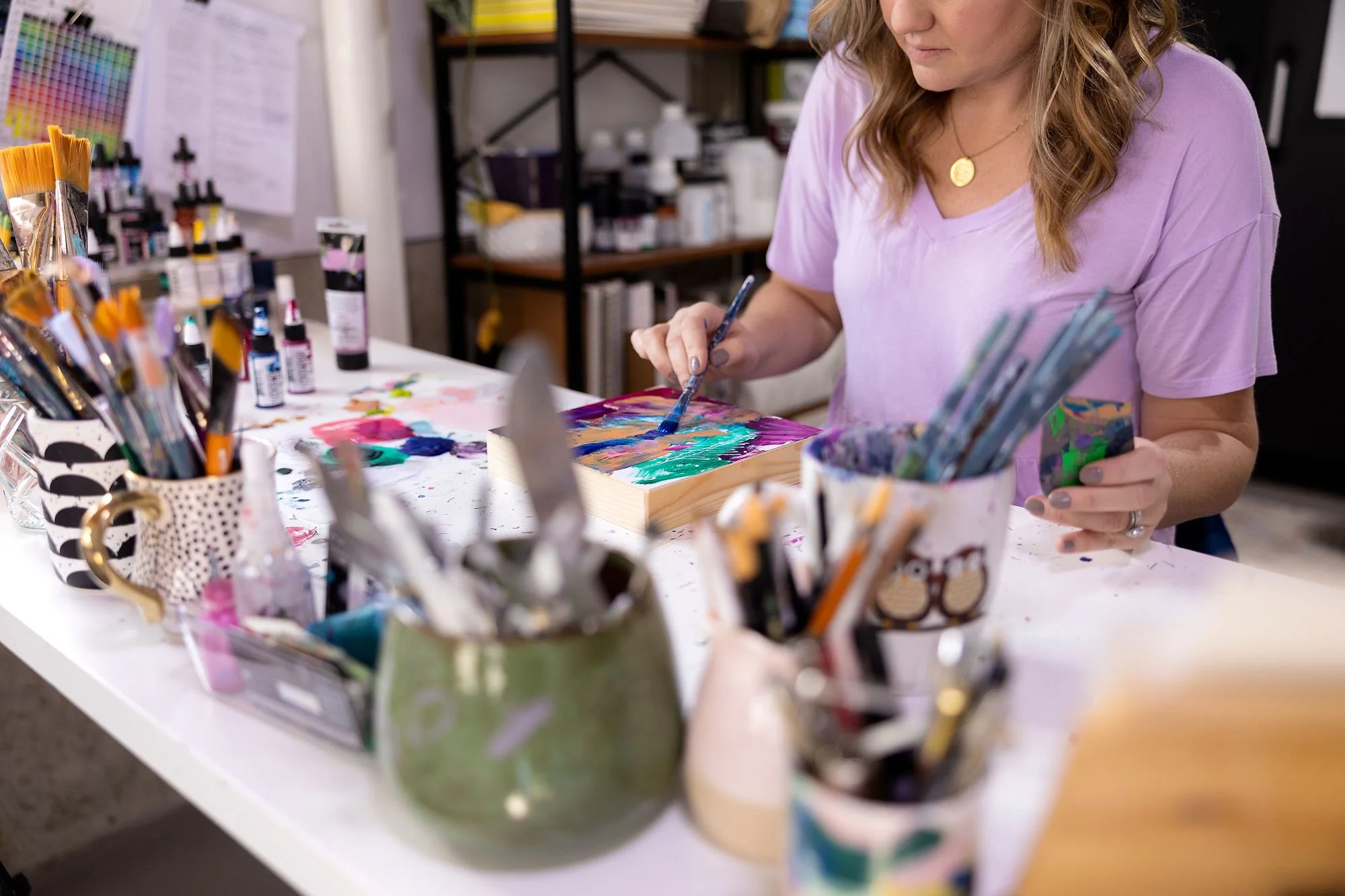 After a decade in the corporate world as a mortgage underwriter, she traded spreadsheets for paint palettes, devoting the past ten years to creating a professional art career showing in various fine art shows and galleries across the region. Over the last three years, her work has evolved into a layered abstract style, rich with texture and etched detail, echoing the complexity of nature and the layered experiences of life.