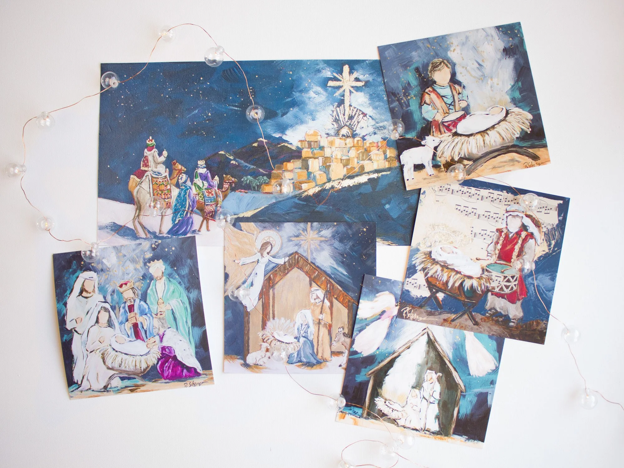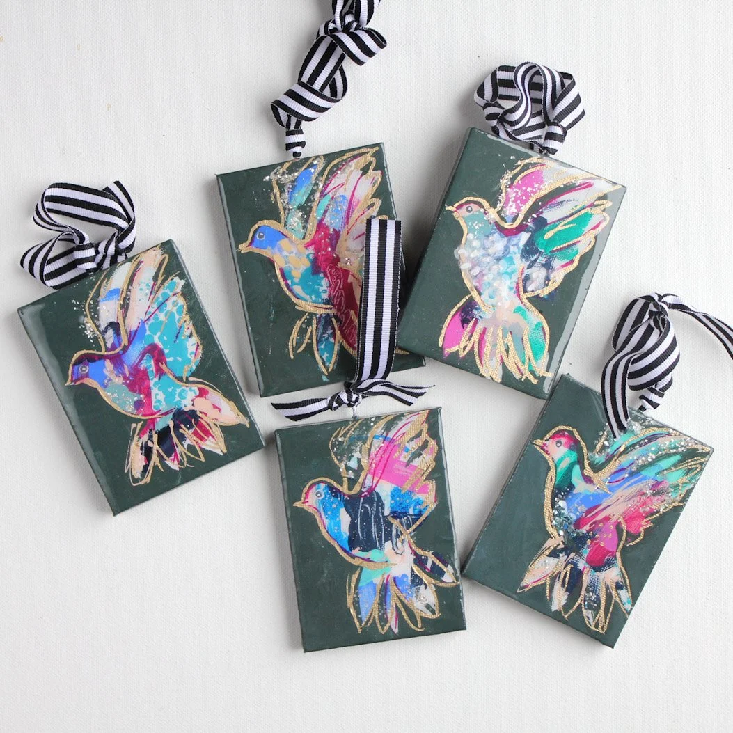 The theme for this year’s holiday shop is Peace and a recurring symbol for peace is doves. Hence, the peace dove original paintings and ornaments. I love creating Biblically inspired Christmas art for the holiday shop every year inspired by my favorite stories.